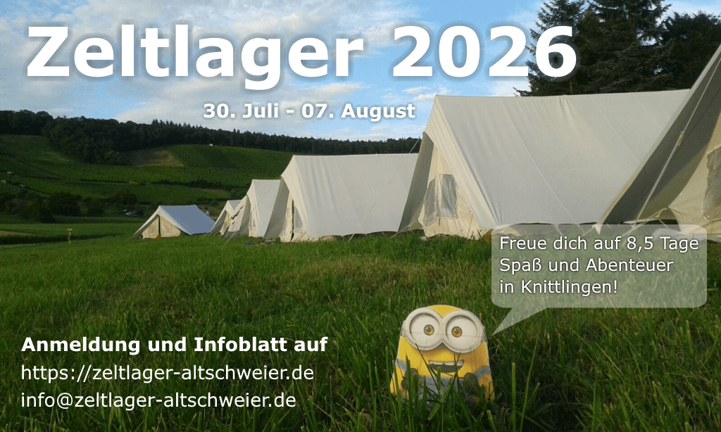 Nachdem die Details mittlerweile geklärt sind und die Planungen nahezu abgeschlossen sind, können wir euch die Anmeldungen und das Infoblatt für das Zeltlager 2026 endlich zur Verfügung stellen.